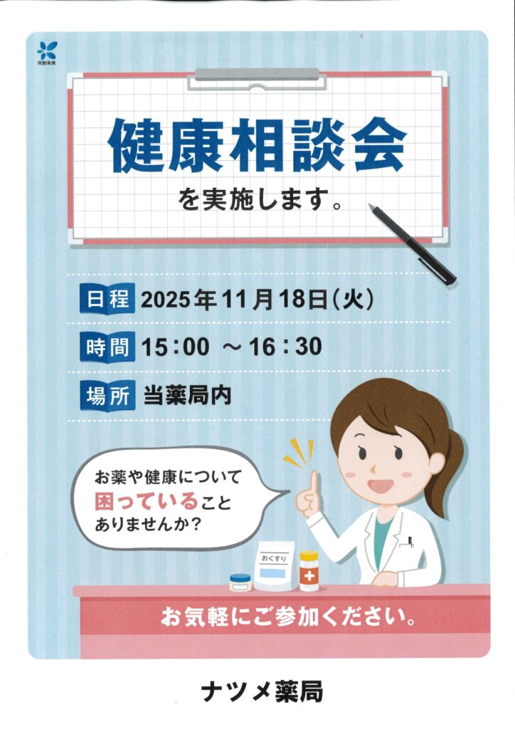 ナツメ薬局の11月健康相談会の日程が決まりました☆